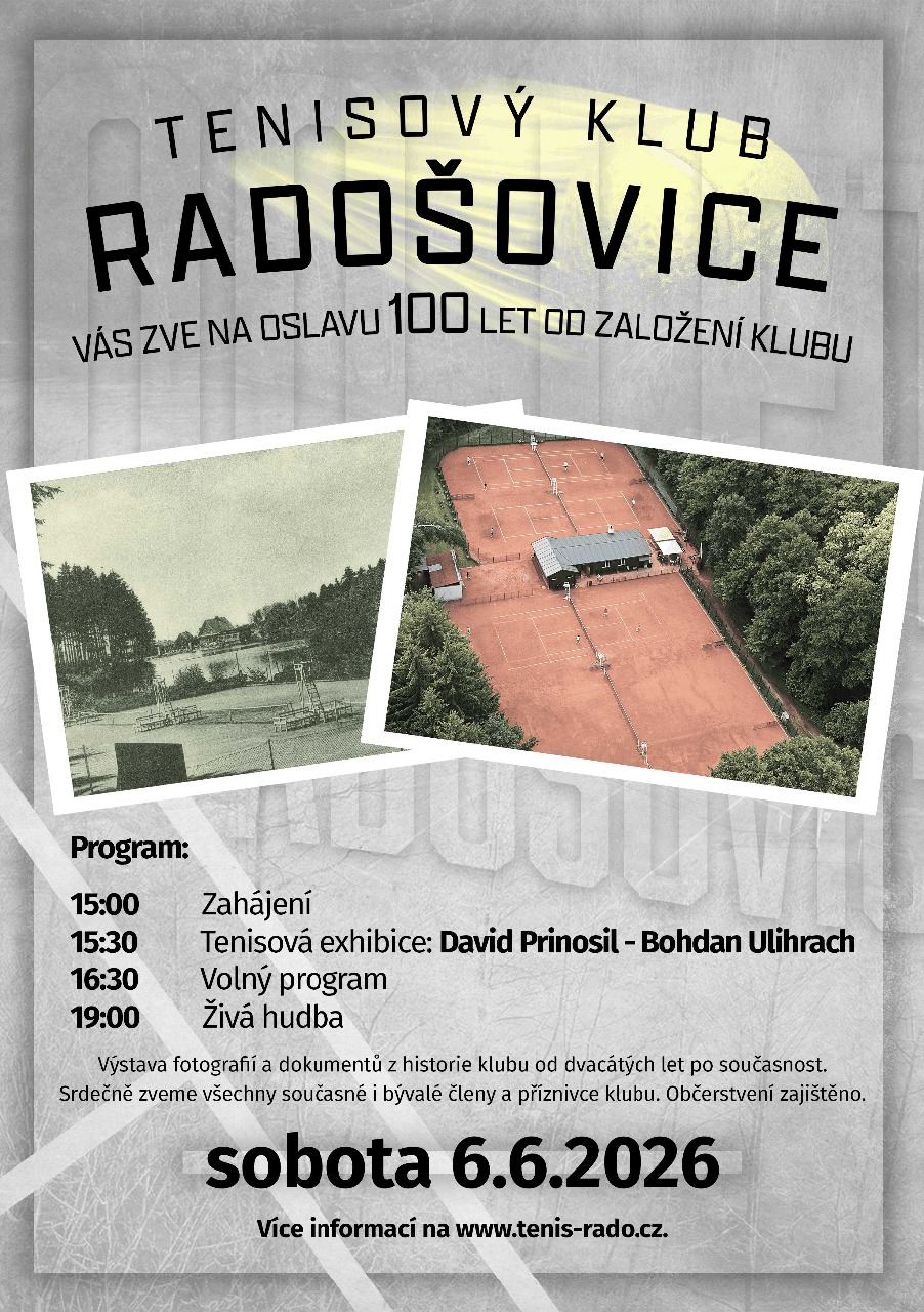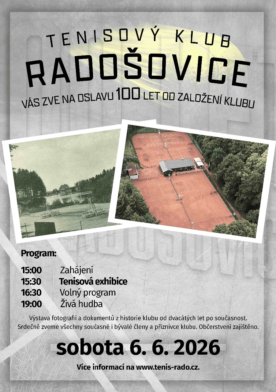 Oslava 100 let TK Radošovice proběhnou v sobotu 6.6. 2026 na kurtech .